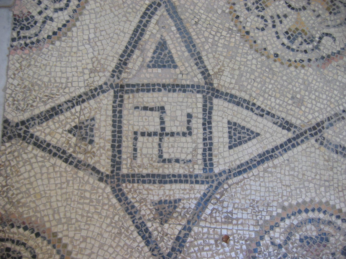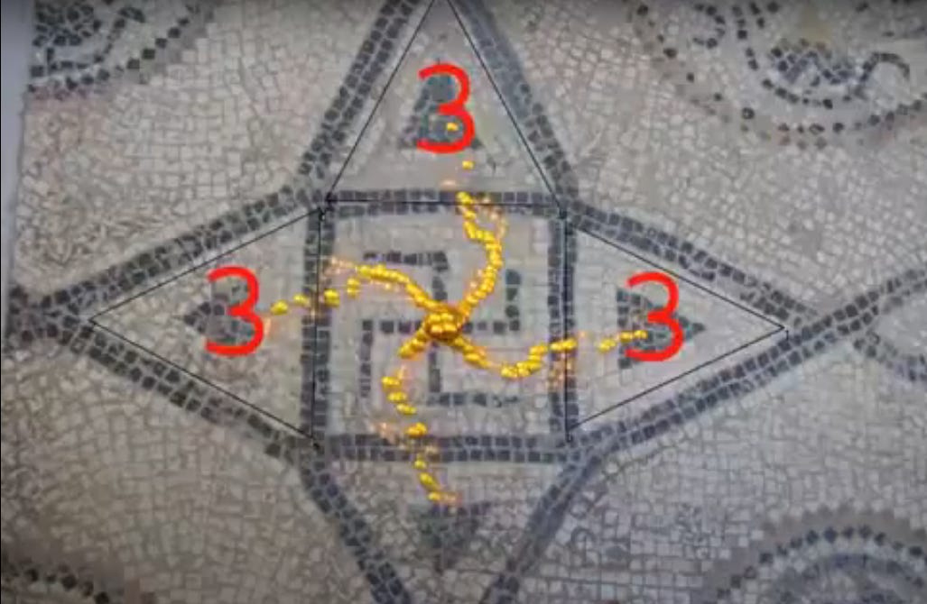 My interpretation of this mosaic is that of a 2-dimensional representation of a Merkaba star with a Swastika in the center. Using this program, you would draw out triangular shapes that would interact with one another creating fractals (beyond that description I have no clue to the actual mathematical workings), after tracing out three of the four points on the ‘star’ and adjusting some of the values a Swastika appears!